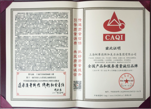 日前,上海柯賽德斯加美石油集團(tuán)有限公司,收到來(lái)自國(guó)家市場(chǎng)監(jiān)督管理總局主管的中國(guó)質(zhì)量檢驗(yàn)協(xié)會(huì)頒發(fā)的“全國(guó)產(chǎn)品和服務(wù)質(zhì)量誠(chéng)信品牌”證書(shū)。品牌涵蓋了“柯賽德斯-加美、中訊高科、柯賽德”三大品牌,產(chǎn)品包括“航天航空潤(rùn)滑油”、“國(guó)防特種潤(rùn)滑油”、“車用潤(rùn)滑油”、“金屬加工液”、“特種合成潤(rùn)滑油”、“特種合成潤(rùn)滑脂”、“工業(yè)潤(rùn)滑脂”、“工業(yè)設(shè)備潤(rùn)滑油”、“船舶潤(rùn)滑油”九大系列產(chǎn)品。