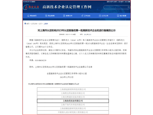 日前,根據(jù)《高新技術(shù)企業(yè)認(rèn)定管理辦法》(國科發(fā)火[2016]32號)和《高新技術(shù)企業(yè)認(rèn)定管理工作指引》(國科發(fā)火[2016]195號)有關(guān)規(guī)定,全國高新技術(shù)企業(yè)認(rèn)定管理工作領(lǐng)導(dǎo)小組辦公室將“上海市認(rèn)定機(jī)構(gòu)2023年認(rèn)定報(bào)備的第一批高新企業(yè)(企業(yè)名單詳見附件)”進(jìn)行備案公示。備案名單中的上海加美實(shí)業(yè)有限公司,早在2020年11月18日便被上海市科學(xué)技術(shù)委員會、上海市財(cái)政局、國家稅務(wù)總局上海市稅務(wù)局3家政府機(jī)關(guān)授予“高新技術(shù)企業(yè)”稱號。此次出現(xiàn)在公示名單中,是對上海加美實(shí)業(yè)有限公司“高新技術(shù)企業(yè)”資質(zhì)的一次復(fù)核通過和一次層次上的升級。