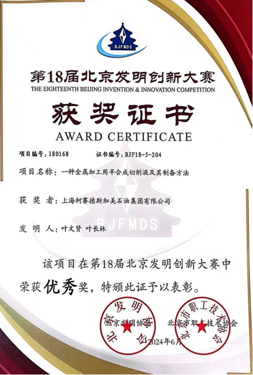 日前,第18屆北京發(fā)明創(chuàng)新大賽頒獎(jiǎng)會(huì)在京成功舉辦,標(biāo)志著這場(chǎng)為期數(shù)月的科技盛會(huì)圓滿落幕。北京市人大常委會(huì)副主任閆傲霜、中國(guó)工程院院士侯立安等領(lǐng)導(dǎo)嘉賓親臨頒獎(jiǎng)會(huì)現(xiàn)場(chǎng),為獲獎(jiǎng)?wù)哳C發(fā)了榮譽(yù)證書。上??沦惖滤辜用朗图瘓F(tuán)有限公司的一項(xiàng)技術(shù),即“一種金屬加工用半合成切削液及其制備方法”,獲得本屆北京發(fā)明創(chuàng)新大賽的優(yōu)秀獎(jiǎng)。