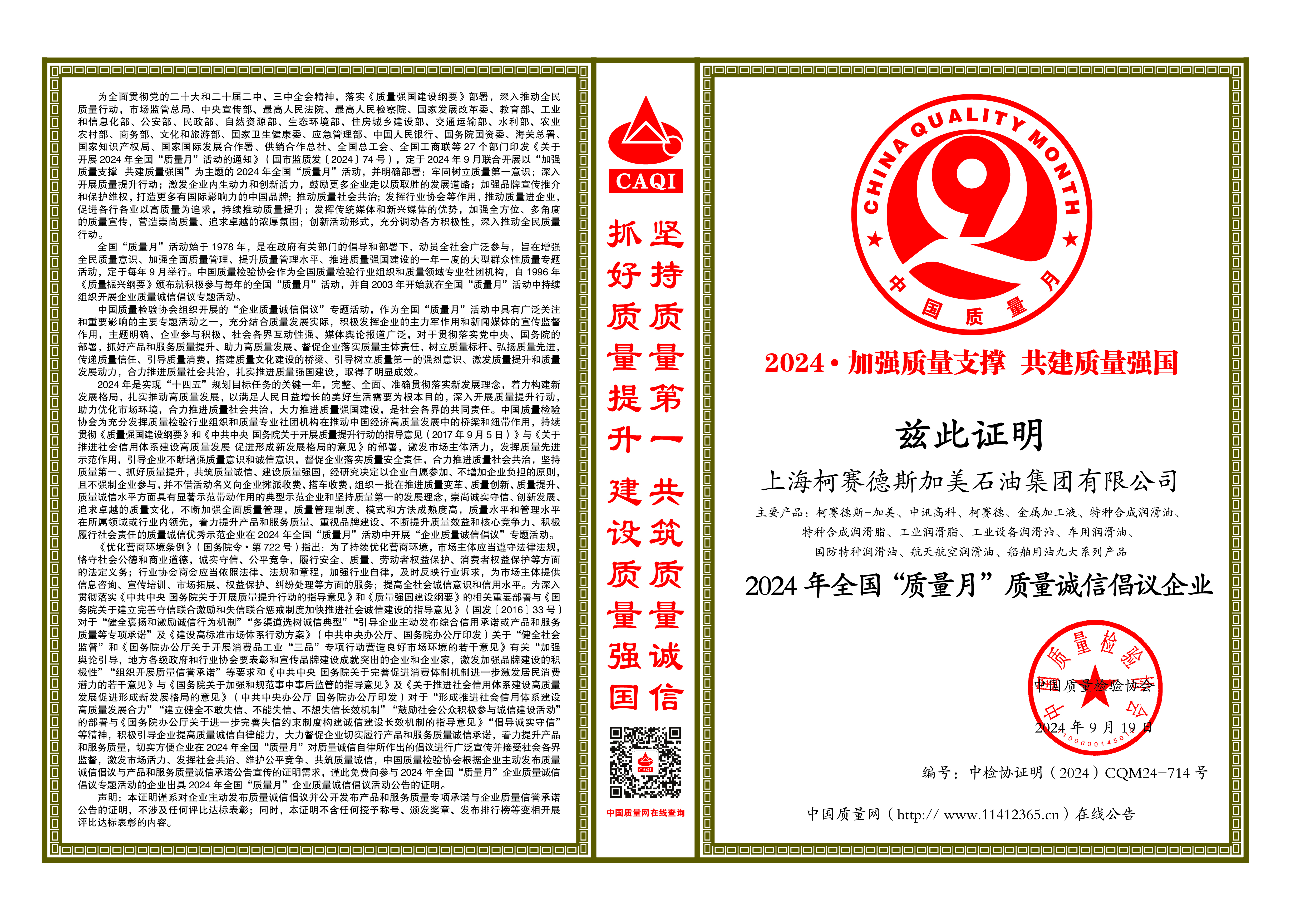 柯賽德斯加美石油集團(tuán)是一家集研發(fā)、生產(chǎn)、銷售和服務(wù)等功能于一體的實(shí)體型能源機(jī)構(gòu)和專業(yè)強(qiáng)勢(shì)的潤(rùn)滑油公司。該集團(tuán)公司統(tǒng)攜旗下運(yùn)營(yíng)的“三大能源品牌”——柯賽德潤(rùn)滑油、中訊潤(rùn)滑油、柯賽德斯-加美潤(rùn)滑油,恒久擎舉科技創(chuàng)新、質(zhì)量保證、經(jīng)營(yíng)誠(chéng)信旗幟,實(shí)現(xiàn)了市場(chǎng)影響力、顧客滿意度、團(tuán)隊(duì)?wèi)?zhàn)斗力的同步提升。該集團(tuán)旗下九大系列拳頭產(chǎn)品風(fēng)電光電水電潤(rùn)滑油、航空航天潤(rùn)滑油、國(guó)防特種潤(rùn)滑油、船舶潤(rùn)滑油、工業(yè)潤(rùn)滑油、高端機(jī)械制造潤(rùn)滑油、高端設(shè)備保養(yǎng)潤(rùn)滑油、高端金屬加工切削液、汽車(chē)保養(yǎng)潤(rùn)滑油,均在連續(xù)多年榮獲“全國(guó)產(chǎn)品質(zhì)量與服務(wù)質(zhì)量誠(chéng)信示范品牌”的同時(shí),先后多年多次通過(guò)ISO9001、IATF16949、IS014001、BS OHSAS18001、GJB9001C等多個(gè)國(guó)際國(guó)家標(biāo)準(zhǔn)化認(rèn)證。