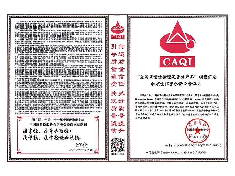 新年伊始,上??沦惖滤辜用朗图瘓F(tuán)有限公司收到來(lái)自中國(guó)質(zhì)量檢驗(yàn)協(xié)會(huì)的證書(shū)(編號(hào):中檢協(xié)證明 CAOICTOCA2025-1088號(hào)),證書(shū)說(shuō):經(jīng)調(diào)查匯總,上??沦惖滤辜用朗图瘓F(tuán)有限公司生產(chǎn)(銷售)柯賽德Kroneseder、中訊高科ZHONGXUN、的柯賽德斯-加美潤(rùn)滑油Kroneseder·Jama 三大品牌(金屬加工油液、特種合成潤(rùn)滑油、特種合成潤(rùn)滑脂、工業(yè)潤(rùn)滑脂、工業(yè)設(shè)備潤(rùn)滑油、車用潤(rùn)滑油、國(guó)防特種潤(rùn)滑油、航天航空潤(rùn)滑油和船舶用油九大系列產(chǎn)品)在近三年(2022年2月至2025年1月)的產(chǎn)品質(zhì)量監(jiān)督抽查和檢測(cè)中均為合格,并對(duì)產(chǎn)品和服務(wù)質(zhì)量誠(chéng)信作出“全國(guó)質(zhì)量檢驗(yàn)穩(wěn)定合格產(chǎn)品”質(zhì)量信譽(yù)承諾公告。